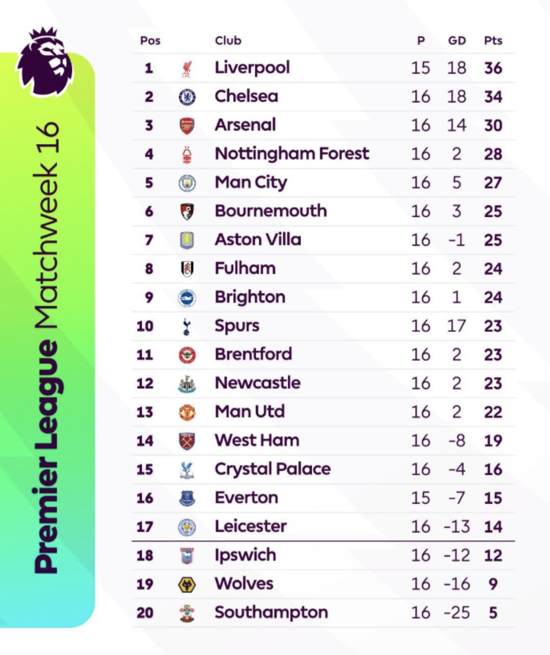 🏆 프리미어리그 현재 순위 (16라운드 기준)