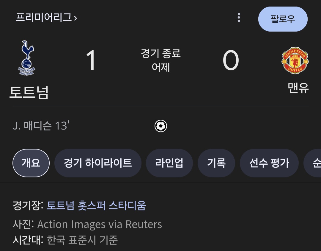 🔥 최종 스코어: 토트넘 1-0 맨유
