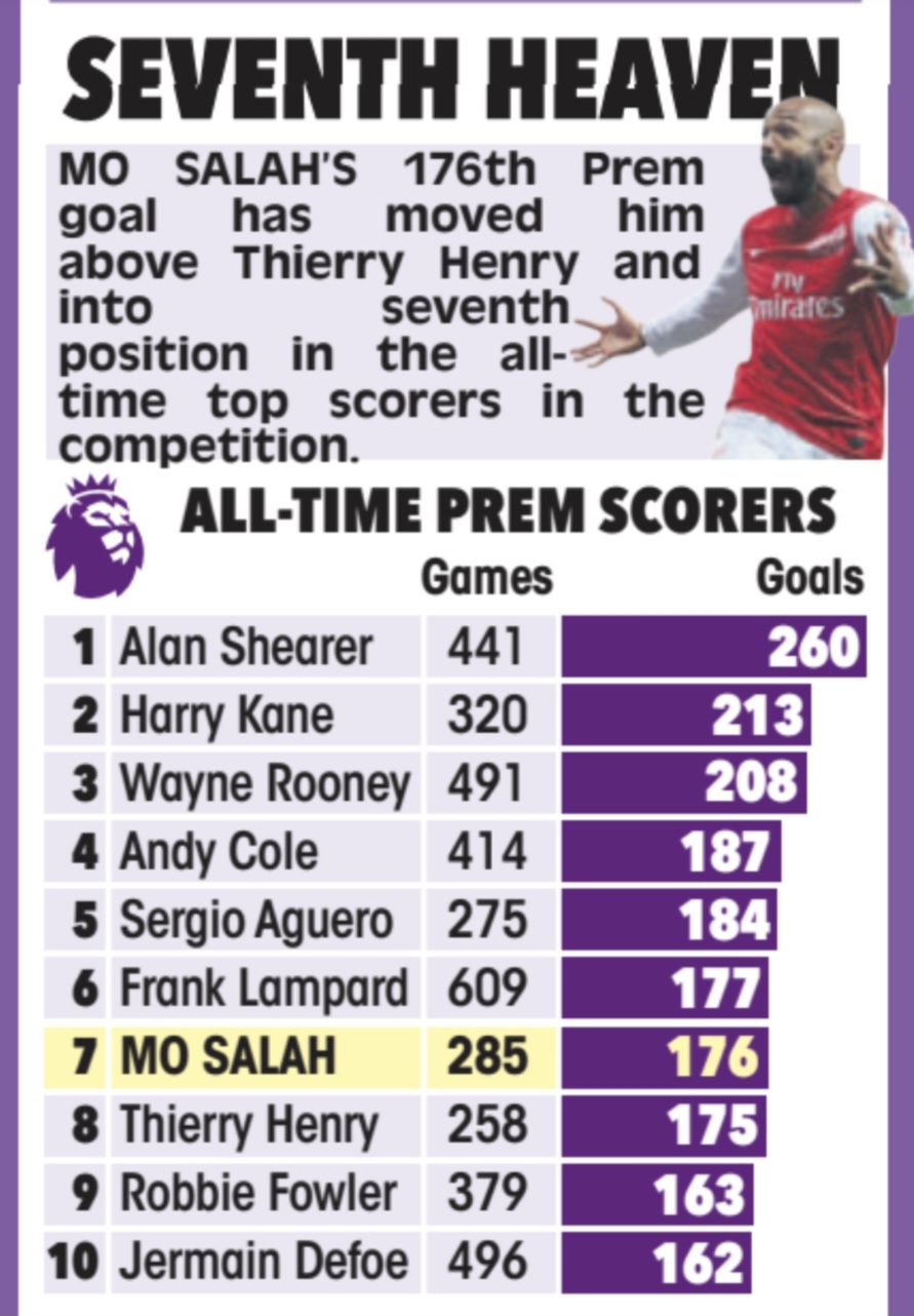 2025년 1월 기준으로, 모하메드 살라는 프리미어리그 역대 득점 순위에서 7위에 올라 있습니다. 이는 아스널의 전설적인 공격수 티에리 앙리를 넘어선 기록으로, 살라의 꾸준한 득점력을 보여줍니다.